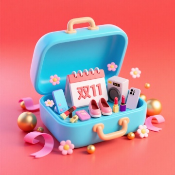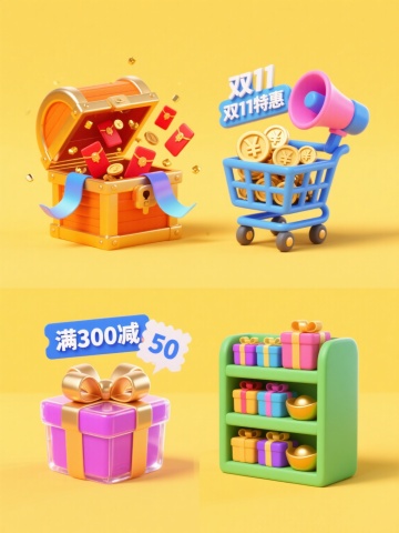 毛绒质感软3D风礼盒,融合卡通元素与喜庆色彩,满载双11促销惊喜,营造欢乐节日氛围。