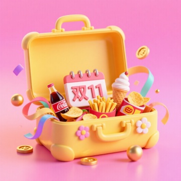 一个打开的红色大手提箱,箱内有一个醒目的“双11” 日历牌,日历牌旁许多商品(薯条、薯片、可乐、冰淇淋等),周围环绕粉色丝带、金色小球、花朵等元素装饰,背景为明亮的黄色渐变,超强的促销感。