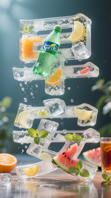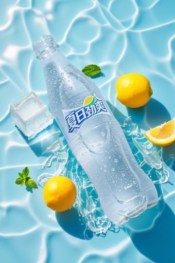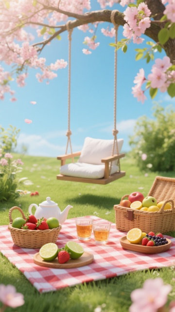 以春日鲜花盛开的花园为背景,中央是巨型参考图的蜜桃气泡水瓶(去掉背景杂色和字)摆在草地上,巨型水瓶内部设计成橱窗形式,展示着各类饮料,树干上有鲜花缠绕的木质招牌写 “双 11 零食节”,周围有蝴蝶、蜜蜂围绕。
