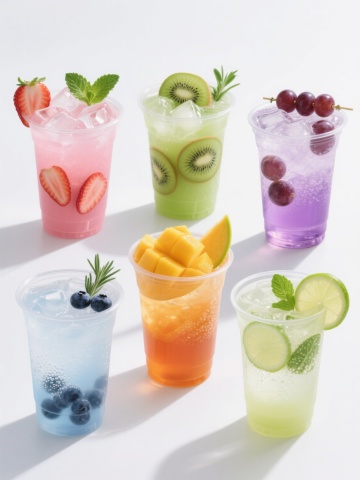 白色背景上,6个完全不同造型的同系列透明塑料杯饮品素材集合规整排布,保持超写实摄影风格,光影明亮通透,杯身和液体有清晰的高光和阴影细节,冰块棱角分明且有透明质感,每个杯子中分别装有不同色彩和元素的饮品:1. 粉红色草莓冰饮,杯口装饰草莓片和薄荷叶,杯壁贴有对半切开的草莓;2. 青绿色猕猴桃冰沙,顶部有猕猴桃果肉块和奇异果切片,杯侧插着小绿叶;3. 紫色葡萄苏打水,杯中漂浮着整颗葡萄和葡萄切片,杯口放有葡萄串装饰;4. 橙色芒果冰茶,杯内有大块芒果果肉和芒果片,杯口斜插芒果角;5. 淡蓝色蓝莓气泡水,杯底沉着蓝莓,杯口装饰蓝莓和迷迭香;6. 浅绿色青柠莫吉托,含青柠片和薄荷叶,杯口插青柠角,液体清澈有气泡,整体构图平衡,每个饮品造型独特,色彩鲜明,细节丰富,适合作为系列饮品宣传素材。
