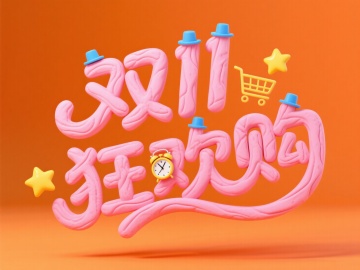 软3D粘土风字体,橡皮管造型搭配小礼帽与购物车,充满甜蜜可爱与趣味感,营造双11狂欢购的促销氛围。