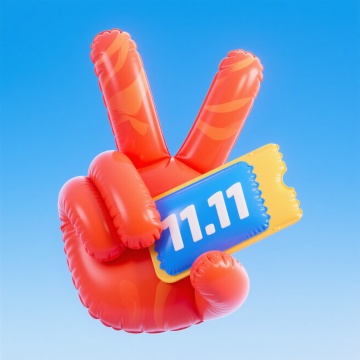 充气风3D手比V,持11.11票根,波普色彩碰撞,重拟物质感,喜庆促销趣味十足。