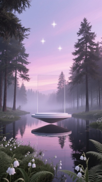 极简主义风格的未来感展示台,悬浮于静谧的深林湖泊中央,湖面倒映着周围高耸的杉树和朦胧的晨雾,背景是梦幻的粉紫色渐变天空,点缀着几颗明亮的晨星,湖边长满了白色的铃兰和蕨类植物,柔和的侧逆光勾勒出展示台的轮廓,整体氛围宁静而神秘,具有超现实的梦幻美感。