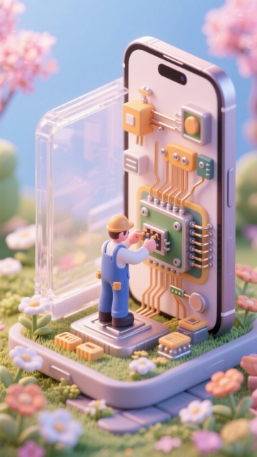 画面中心是巨型建筑(建筑细节:和手机外形相近,发光效果)周围有未来感城市建筑、彩色星球、云、商品店铺、奇特植物,背景是星空,低饱和蓝粉色调
