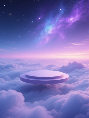 3D渲染风格的展台场景,画面中央有一个圆形的白色展台,展台周围环绕着大量蓬松、柔软的淡紫色云朵,云朵呈现出棉花糖般的质感,边缘柔和,带有细腻的纹理。背景是渐变的深蓝色天空,点缀着几缕轻薄的白色云彩,光线从云层间隙洒落,形成柔和的光束,照亮展台顶部,营造出梦幻、宁静且略带神秘感的氛围。整个场景色彩和谐,以紫色和蓝色为主色调,光影过渡自然,构图采用对称美学,展台位于画面中心,成为视觉焦点,周围的云朵和天空元素围绕展台展开,形成平衡的视觉引导线,整体画面干净整洁,空间感强。