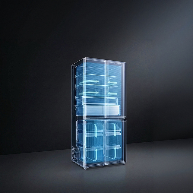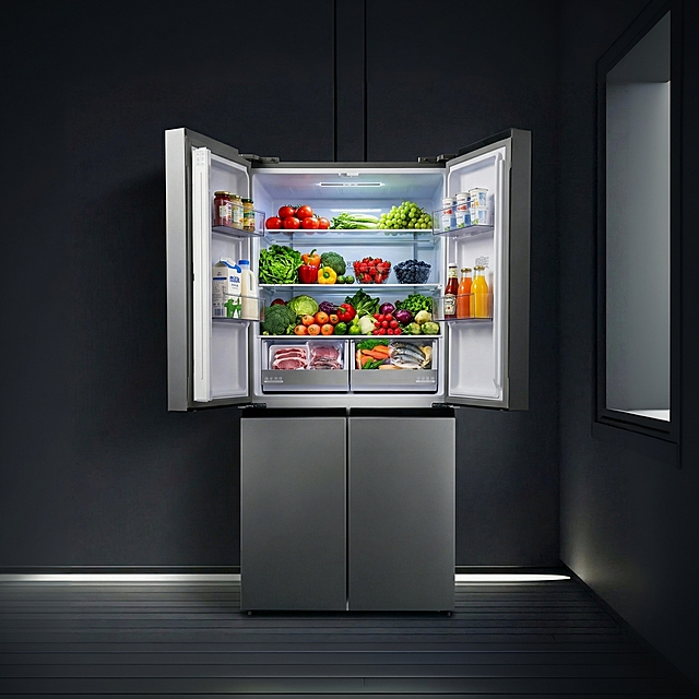 保持产品形态特征细节,为这个冰箱添加食物带除菌效果光效并添加一个高级黑灰色简约场景详情
