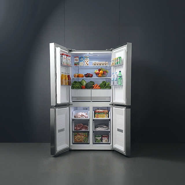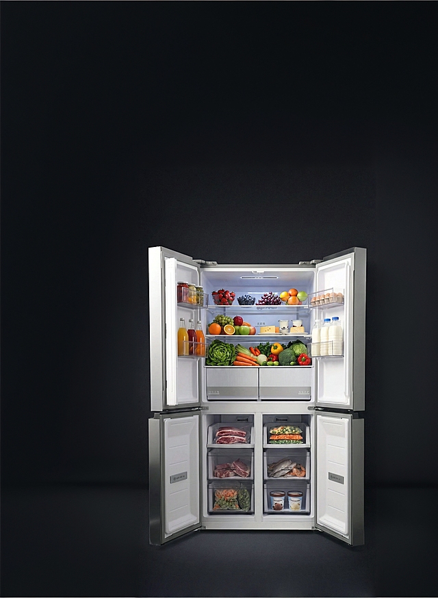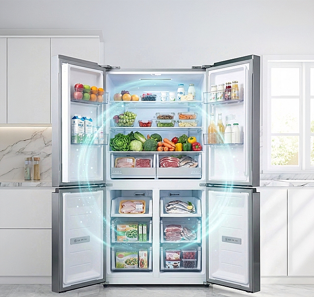 保持产品形态细节特征,添加一个简约的场景冰箱靠墙,为冰箱添加食物,带除菌效果示意,全空间除菌营造鲜净空间详情