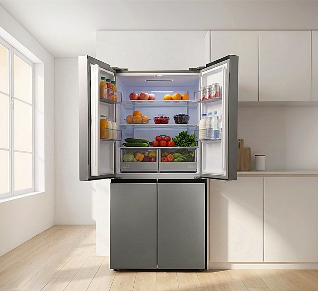 保持产品形态细节特征,为这个冰箱添加果蔬饮料,并添加一个厨房场景,冰箱单独摆放不嵌入墙体详情