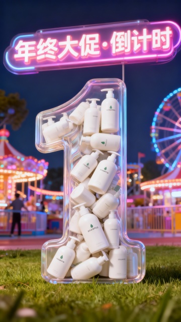 将图中的商品裂变出无数个(商品比例外观一致),通过旋转堆叠的方式填充到“1”数字形状的透明容器中,透明容器被商品填满不留一丝空隙。“1”立在草地上,柔和的光泽纹理,背景是游乐场梦幻氛围。画面顶部为巨大荧光质感文字灯牌“年终大促·倒计时”。