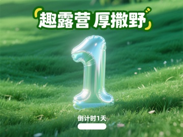 清新软3D风设计,数字“1”气球置于绿草坪,营造趣露营氛围