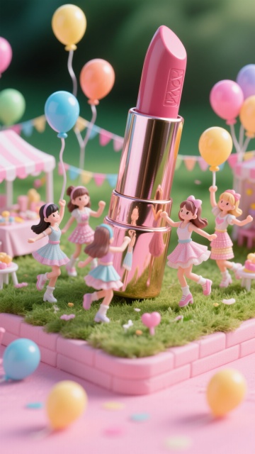 3D风微缩艺术,甜美梦幻波普设计,可爱女孩环绕唇膏,节日氛围浓厚。