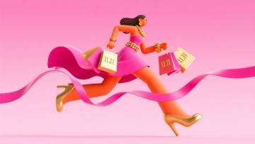 时尚的女人前大步奔跑,一只手拿着红包,有很多优惠券从红包溢出来,红包上印着”11.11“。人物细节:身上挂满金饰,拖尾裙。金色丝带在周围环绕贯穿画面,粉色背景