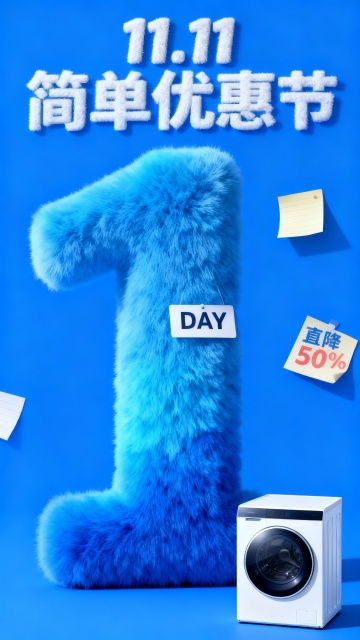 主视觉为一个蓝青色渐变毛绒材质的“1” ,“DAY”标签位于数字“1”上,商品位于画面右下角,背景是高饱和蓝色结合便签纸元素,画面上方为毛绒主标题“11.11 简单优惠节”,“直降50%”便利贴装饰。