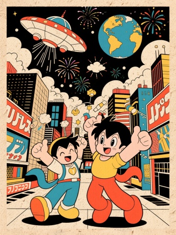 夸张的漫画风格设计,拼贴画,广告插图,复古风格,两个比例夸张的卡通形象的人物位于下方庆祝,上方有地球,飞船。人物周围环绕着各种图案和文字,包括烟花,云等元素,牛皮纸背景,超清
