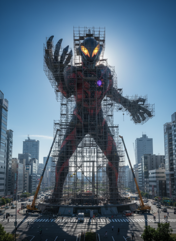 上传图中的人物主体,化身为现代城市中正在建设的巨型艺术雕塑装置。该巨型人物周围环绕着大面积脚手架,背景是澄澈蓝天与细节丰富的城市景观(包含街道、建筑、车辆,以及底座周围的渺小人群),整体画面超细节呈现,兼具真实纹理质感与超现实巨型艺术品美学风格。
