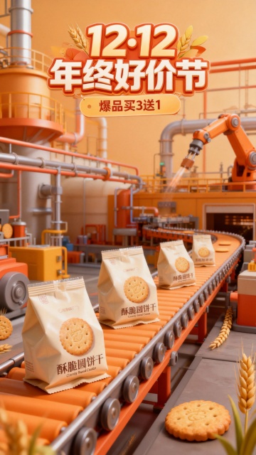 科技感与工业风融合的3D重拟物场景,虚拟现实质感的生产线传递促销氛围,金属色调强化现代感,烘托12.12年终好价节的节日热度。