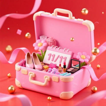 一个打开的亮黄色大手提箱,箱内有一个醒目的“11/11” 日历牌,日历牌旁许多商品(鞋子、口红、手机、家电等),周围环绕粉色丝带、金色小球、花朵等元素装饰,背景为亮红色,超强的促销感。