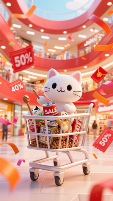 软3D风格卡通人物推满购物车,商场环绕促销彩带与折扣标签,拟人化设计充满喜庆与促销感,塑料质感强化视觉冲击,营造节日购物狂欢氛围。