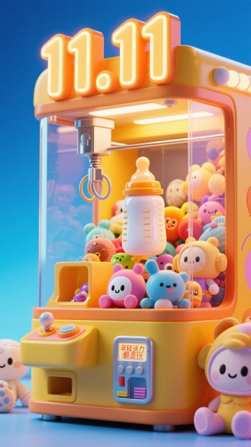 3D写实风格,将画面中的主体提取到一个娃娃机里,主体重复的、拥挤的、密集且杂乱堆叠,堆满娃娃机内部,不留任何空隙,促销风格,娃娃机是红黄配色的,上面写着用优雅的字体写着“双11”,背景是红色渐变,有一些金色碎屑点缀,有光线效果。