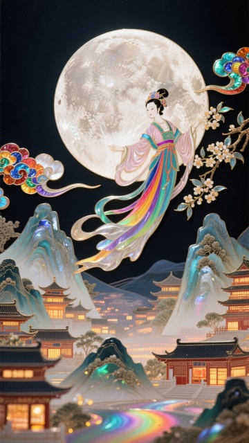 梦幻唯美的中式古典画面,工笔风与国潮元素融合,嫦娥飞天于满月之下,彩带如虹,刺绣质感与鎏金细节交织,尽显浪漫中秋意境。