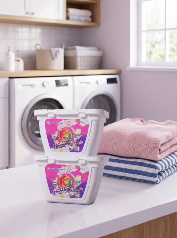 制作这瓶羽绒服洗衣液的电商主图,把它放在治愈的浴室场景,旁边有羽绒服