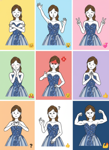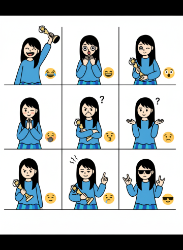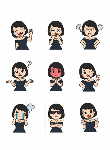 保持人物主体不变,创作一组简笔画风格表情包,搭配一些emoji图标,包含表情不同、姿势不同的九宫格表情包