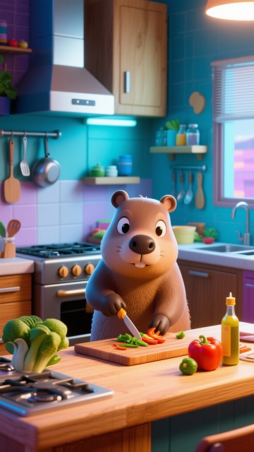 3D卡通风格,拟人小屋与厨师互动,超现实童话场景,可爱温馨。