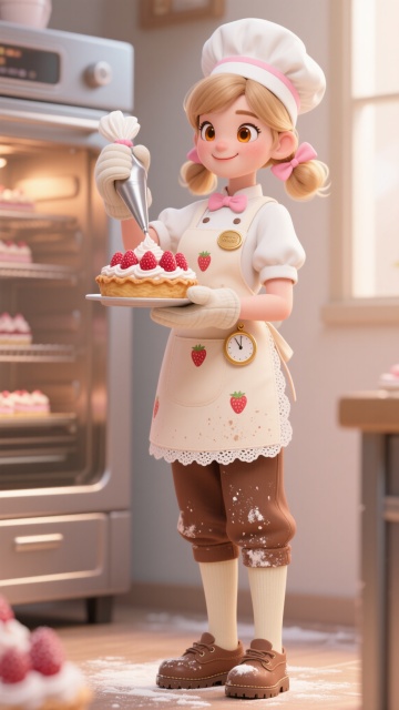 3D卡通风格的年轻女性糕点师形象,整体呈现甜美治愈的氛围,主色调为奶油白、草莓粉和巧克力棕。采用柔和的漫反射光影,光源来自左侧烘焙烤箱,形成暖调高光和蛋糕粉阴影,表面质感如同哑光釉面带有细腻珠光。画面主体是一位嘴角上扬的烘焙师少女,她有着亚麻金的低双马尾,发梢点缀着迷你糖霜蝴蝶结,头戴白色厨师帽配粉色缎带,眼睛是杏仁形琥珀色,闪烁着专注的光泽。她穿着奶油色泡泡袖厨师服,胸前点缀着草莓图案围裙,白色蕾丝领边露出,下身是浅棕色背带裤,裤脚收紧在奶油色及膝袜外,脚上穿着棕色防滑厨师鞋,鞋头沾着微量面粉。她的左手戴着隔热手套托着刚出炉的莓果挞,右手持银色裱花袋正在装饰奶油,手腕上挂着草莓形状的计时器,胸前挂着金色圆形名牌。构图采用3/4侧身视角,人物偏右站立,姿态优雅专业,充满烘焙师的温柔气质。细节丰富,包括厨师服上的面粉痕迹、围裙上的糖渍斑点、莓果挞的糖霜纹理和裱花袋的奶油挤压状态都清晰可见,整体造型甜美专业,充满烘焙工作室的温馨气息。白色背景。