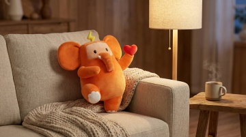 软3D风格的毛绒收纳盒拟人化,推着装满玩具的小车,充满可爱与趣味感,橙色背景强化双11梦幻氛围。