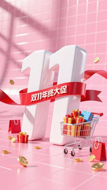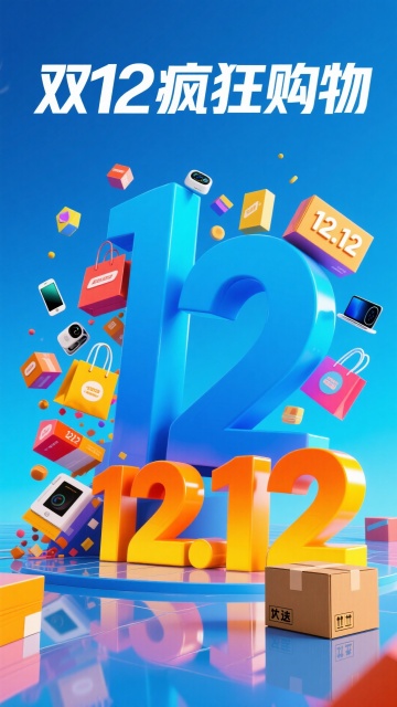 创作一幅卡通 3D 风格的 双11促销海报,整体以暖橙色为主色调,色彩明亮,营造热闹欢快的购物氛围。画面上方有醒目的白色粗体大字 “双11疯狂购物”;左侧和中间区域,大量色彩缤纷的商品(包括各色购物袋、包装盒、电子产品、带有 “11.11” 标识的物品等)从左向右如潮水般倾泻而下,充满动感与活力;右下角有立体的橙黄渐变 “11.11” 数字,旁边摆放着一辆装满商品的购物车,地面还有带有快递标识的棕色纸箱,地面带有光泽反射,增强画面的质感与空间感。
