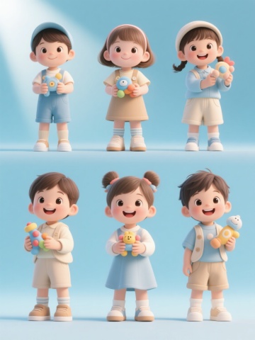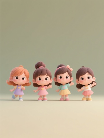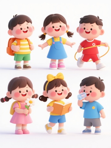 Q版可爱卡通风格儿童系列素材套系,4个不同场景,每个场景中都有一个Q版儿童坐在不同物品上。第一个场景:一个扎着双马尾的小女孩,穿着带有粉色花朵图案的白色连衣裙,蓝色袜子配红色小皮鞋,正开心地坐在黄色纸飞机上,右手举起食指指向天空,眼睛看向手指方向,表情天真可爱,整体呈现出圆润的3D立体效果,色彩明快柔和,边缘光滑无棱角,背景为纯白色。第二个场景:一个Q版儿童坐在一本打开的彩色书本上,书本有明显的书页层次感,儿童穿着与第一个场景风格统一的可爱服饰,表情愉悦,姿态自然。第三个场景:一个Q版儿童坐在弯弯的黄色月亮上,月亮表面有柔和的光泽感,儿童或躺或坐,姿态舒适惬意,服饰保持Q版可爱风格。第四个场景:一个Q版儿童坐在几级彩色的台阶上,台阶有立体感,儿童坐在台阶中间或最上层,表情活泼,整体风格与前三个场景统一,色彩搭配协调,所有场景均无LOGO、电话地址及二维码。