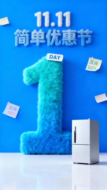 主视觉为一个蓝绿色渐变毛绒材质的“1” ,“DAY”标签位于数字“1”上,商品位于画面右下角,背景是高饱和蓝色结合便签纸元素,画面上方为毛绒主标题“11.11 简单优惠节”,“直降50%”便利贴装饰。