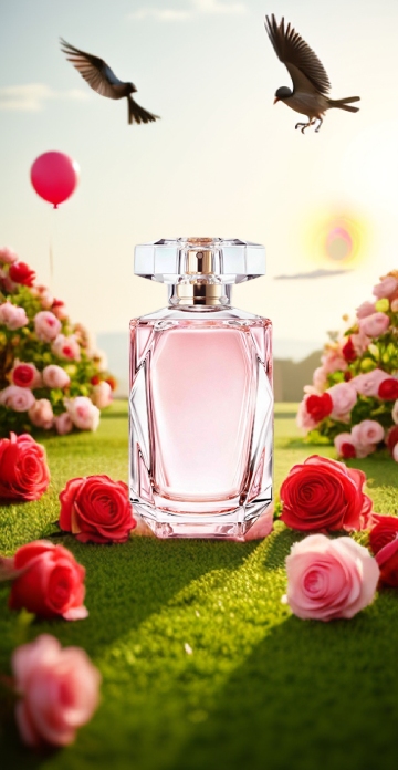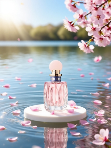 一个精致的香水瓶,瓶身透明,里面装着淡粉色的香水液体,瓶盖是金色的,带有精致的花纹,瓶身周围有几片飘落的花瓣,背景是柔和的淡紫色,整体画面优雅浪漫,光线柔和,细节清晰