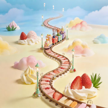 梦幻风格的野外场景中,一列蒸汽火车缓缓行驶在蜿蜒的铁轨上,车身被浓密的蒸汽笼罩,呈现出一种神秘而温暖的氛围。火车车厢上装满了各式各样的美食,如热气腾腾的包子、金黄酥脆的炸鸡、色彩缤纷的水果拼盘和香气四溢的蛋糕,每一样美食都用细腻的笔触描绘,仿佛可以闻到它们的香味。火车的车头部分设计得可爱而富有童趣,烟囱喷出的不是黑烟,而是彩色的烟雾,增添了一丝奇幻色彩。远处是一片繁华的城市,高楼大厦在阳光下熠熠生辉,天空中飘着几朵蓬松的白云,阳光明媚,使整个画面显得清新明亮。画面整体呈现出一种童话般的梦幻感,色彩鲜艳、线条柔和,充满童真与想象力。