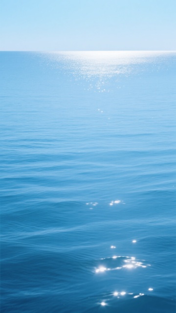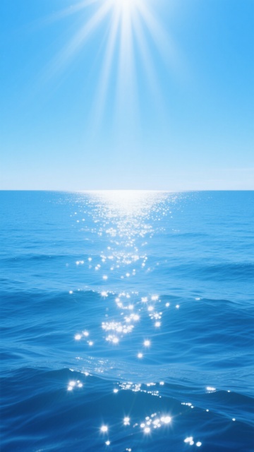 晴朗无云的蓝天背景下,阳光从画面顶部中央位置以强烈的放射状光束洒落,照亮一片广阔无垠的海面,海水呈现出由近及远逐渐变浅的多层次蓝色调,近处为深邃的靛蓝色,向远处过渡为明亮的天蓝色,海面上布满因阳光折射而产生的密集白色闪光点和波光粼粼的涟漪,波浪呈现出自然柔和的起伏形态,整体营造出宁静、开阔、明亮且充满生机的氛围,画面简洁纯净,无任何多余元素干扰,仅以海天相接的水平线分隔上下空间,光影对比鲜明,高光区域集中在海面中央偏上位置,形成明显的视觉焦点。