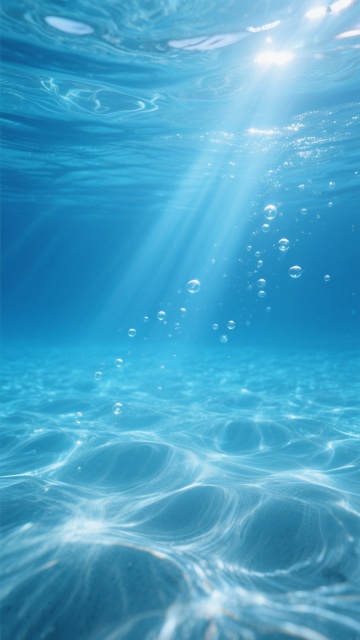 写实风格的水下摄影照片,清澈透明的蓝色水域,水面波光粼粼,阳光透过水面形成明亮的光束,照亮水中悬浮的细小气泡,底部呈现自然的水波纹光影效果,整体画面宁静、通透,充满梦幻般的光影氛围,色彩以深浅不同的蓝色为主调,光影对比柔和,细节清晰,具有真实水下环境的质感和视觉效果。