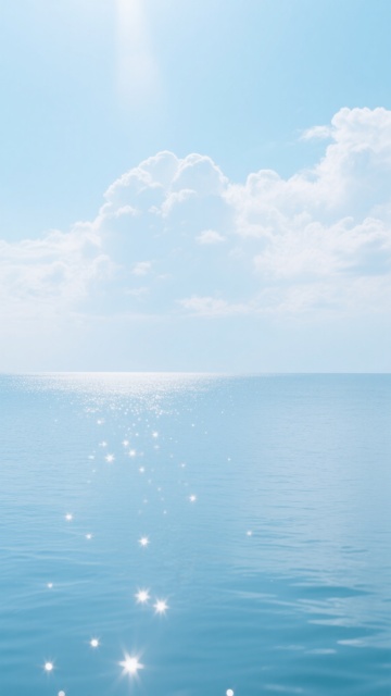 清澈的海面,海水呈现从深蓝到浅蓝的渐变色调,波光粼粼的水面上有许多白色的光斑,阳光透过海水形成清晰的光影纹路,远处是洁白的云朵和湛蓝的天空,整体画面宁静而明亮,清新自然
