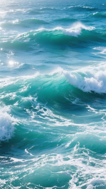 超写实风格的海面背景,清澈透明的蓝绿色海水,阳光照射下水面波光粼粼,呈现出丰富的光影变化和细腻的波纹质感,远处海天相接,天空中漂浮着洁白的云朵,整体画面宁静而明亮,营造出清新自然的氛围。