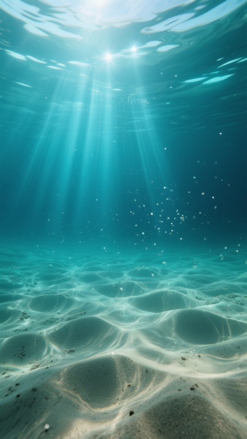 超写实水下场景,深邃的蓝绿色调,底部是纹理清晰的沙质海床,呈现出自然的波浪状起伏。光线从水面上方以分散的放射状光束穿透水体,较原图更柔和且分布更广,光束边缘带有轻微的光晕效果,照亮水中悬浮的微小颗粒,营造出梦幻而宁静的氛围,整体光影过渡自然,色彩和谐统一,画面具有强烈的空间纵深感。
