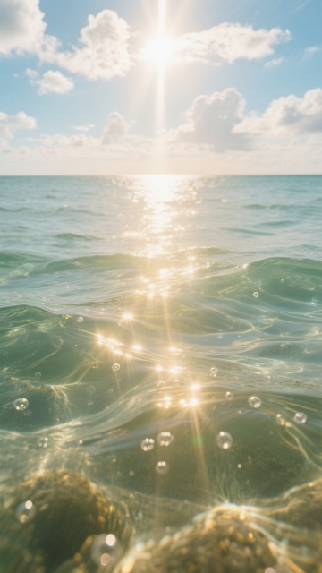 清澈的海水从底部延伸至画面中央,水面波光粼粼,阳光从海面上方斜射下来,形成金色的光线穿透海水,照亮水中的细小气泡和波纹,天空中布满白色的云朵,光线柔和而温暖,整体呈现出宁静而明亮的氛围