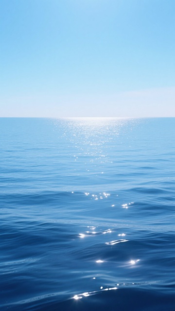 3D渲染风格的海面背景,以纯净的渐变蓝色为主色调,从深邃的海水蓝平滑过渡到清澈的天空蓝,营造出宁静、开阔、通透的氛围。阳光以柔和的顶光照射,在水面上形成细腻且均匀分布的波光粼粼效果,海面上布满规则而轻柔的波浪纹理,波浪线条流畅自然,呈现出平滑的3D质感和细腻的透明感。采用全新的低角度视角,仿佛从靠近海面的位置向上仰望,展现海水与天空在远处完美交汇的水平线,整体画面简洁干净,信息传达直接,充满平静而广阔的设计感。