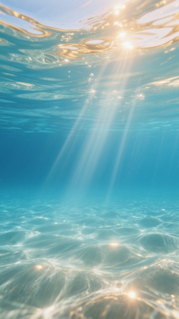 清澈透明的海水,水面下呈现由浅至深的渐变蓝色,底部平滑均匀,顶部水面波光粼粼,阳光从水面斜射进入,形成更加明显且带有金色调的光线折射效果,光线在水中形成细长的光束,照亮部分水域,营造出梦幻而温暖的水下光影氛围,整体画面保持数字艺术的平滑质感和宁静氛围。