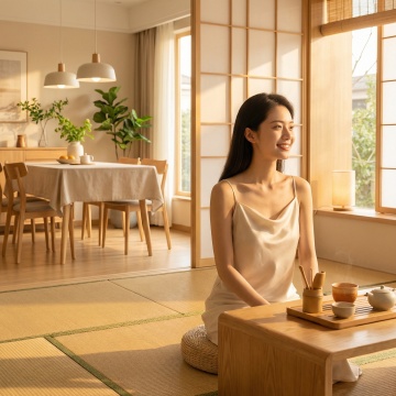 餐后的客厅,家人围坐在沙发或矮桌旁,充满生活化的欢乐。爷爷和爸爸坐在小桌旁,手里拿着麻将牌却转头听奶奶讲过去的中秋趣事;两个孩子趴在地毯上,举着兔子灯追逐打闹;妈妈靠在沙发上,笑着用手机拍孩子们的背影。桌上放着吃剩的半盘月饼和空茶杯,电视开着静音,画面是中秋晚会,沙发上搭着几件薄外套,角落的绿植上挂着小彩灯,整体画面乱中有序,自然不刻意,充满家人相处的快乐氛围