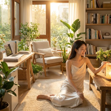 明亮通透的极简主义风格直播间背景,温暖的米白色墙壁与浅木色地板形成柔和基调,大面积自然光透过窗户洒入,在墙面投下清晰的竖条纹光影和植物阴影,营造出宁静舒适的氛围。房间内摆放着不同角度和布置的简约家具:浅色木质小圆桌,桌面可放置书籍或装饰品,旁边是大型绿植如龟背竹,搭配白色花盆,墙角挂有简约风格的抽象装饰画。地面铺有圆形浅色地毯,整体色调以米白、浅木色、淡绿色为主,光线柔和且层次分明,适合作为温馨自然的直播背景环境。