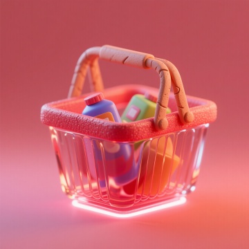 未来感购物篮,软3D风设计,塑料质感,悬浮效果,科技与日常结合。
