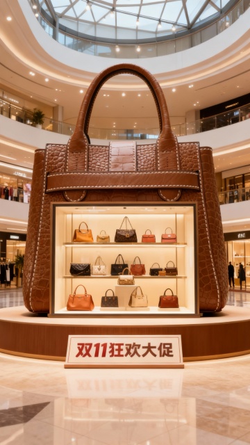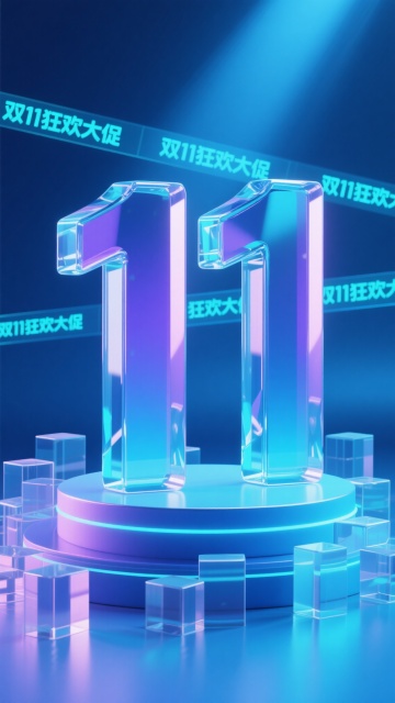 3D立体数字“2”内嵌浅蓝手袋,透明箱体搭配霓虹灯效,科技感与时尚感交融,塑料质感强化视觉冲击,双11预售倒计时主题鲜明。