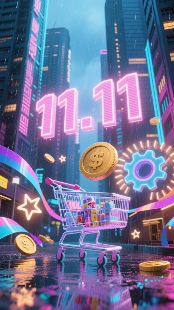 赛博朋克风3D场景,霓虹灯辉映雨夜都市,购物车满载商品,金币飞舞,粒子特效环绕,未来感十足的双11促销狂欢。