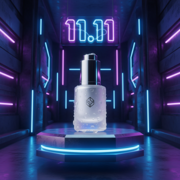 赛博朋克风3D场景,霓虹灯辉映的未来感隧道中,金属质感瓶身置于发光基座,光影交错,营造酷炫梦幻的双11虚拟现实氛围。