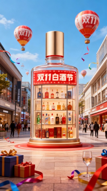 以商场街道为背景,中央是巨型白酒摆在地上,巨型白酒内部设计成橱窗形式,展示着各类化白酒,橱窗上红色灯牌写着“双11白酒节”。礼盒、酒杯、彩带元素装饰画面,背景点缀“双11”文字白酒造型热气球。