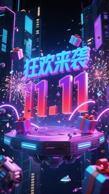 赛博朋克风3D海报,霓虹灯与粒子特效交织,未来感十足的悬浮平台承载“狂欢来袭11.11”,喜庆礼盒与烟花绽放,科技与节日氛围碰撞。